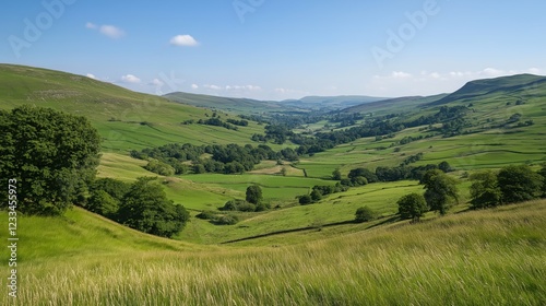 © Yopi, Fototapeta premium Tranquil Green Valley Landscape Under Bright Blue Sky