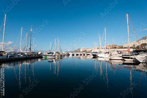 Fototapeta premium Tranquil harbor with sailboats on clear day