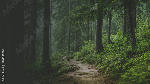 © Dinali, Naklejka premium Tranquil hiking trail through a lush green forest in the morning mist, showcasing natures beauty and peaceful solitude Concept of adventure, exploration, and environmental conservation