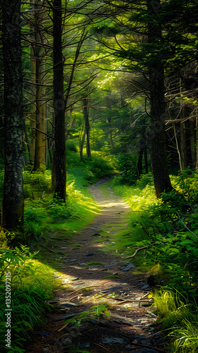 Naklejka premium Tranquil Hiking Trail Winding through Lush Woodland under a Sunlit Canopy -...
