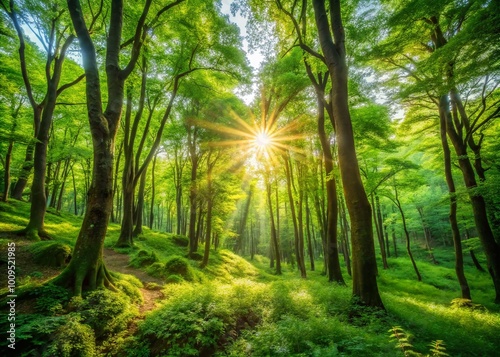 © Man888, Fototapeta premium Tranquil Hokkaido Forest Landscape with Lush Greenery and Sunlight Filtering Through the Trees