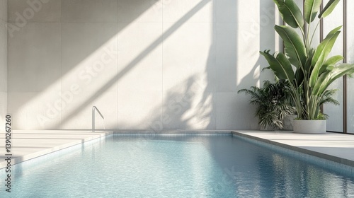 Obraz premium Tranquil Indoor Swimming Pool Surrounded by Lush Green Plants and Sunlight...