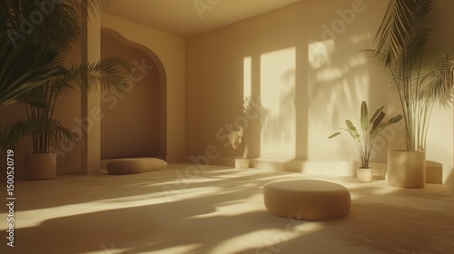 © Minang Art_Studio, Fototapeta premium Tranquil interior space bathed in golden sunlight.