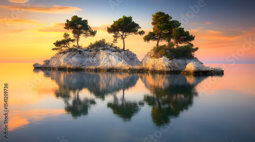 © Sartika, Obraz premium Tranquil island trees reflection at sunset