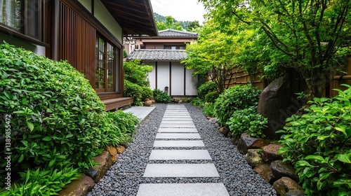 Fototapeta premium Tranquil japanese backyard garden pathway nature haven stone walkway serene...