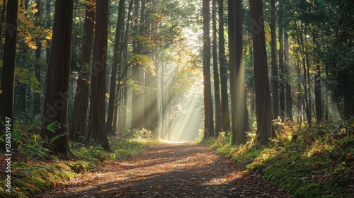 © Jakkarin, Fototapeta premium Tranquil Japanese Forest Path with Sunlight Streaming Through Trees