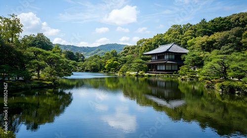 Fototapeta premium Tranquil Japanese Garden Pond With Traditional House