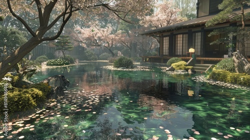 Naklejka premium Tranquil Japanese garden with ponds and cherry blossoms backdrop