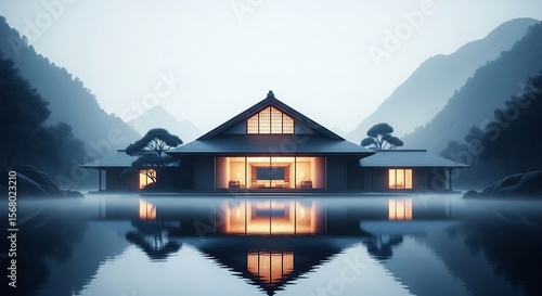 © Adi, Fototapeta premium Tranquil Japanese House Reflection on Lake