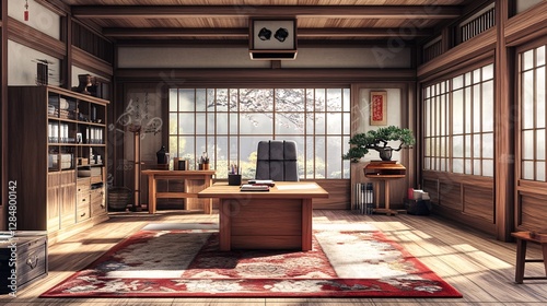 Obraz premium Tranquil Japanese-Style Home Office with Garden View