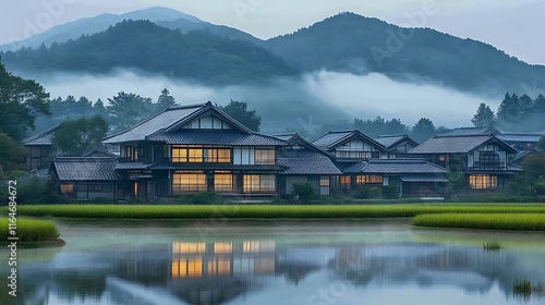 Naklejka premium Tranquil Japanese Village Houses Reflected in Still Water