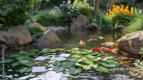 Fototapeta premium Tranquil Koi Pond Blank Business Cards Amidst Serene Water Plants and Graceful Koi Fish Portfolio Table Design for Pond Company