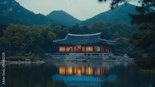 Fototapeta premium Tranquil Korean Palace on Lake with Stunning Night Reflections and Lush Forest Background