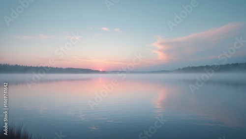 Fototapeta premium Tranquil Lake at Dawn with Fog and Soft Pastel Sunrise