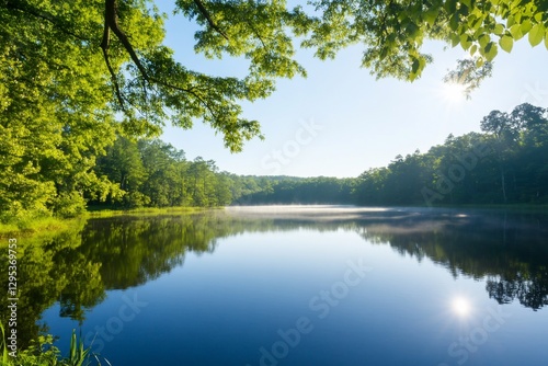 © Artificialstock, Obraz premium Tranquil lake at sunrise with mist and lush foliage.