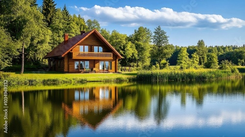 Fototapeta premium Tranquil Lake House Amidst Lush Greenery