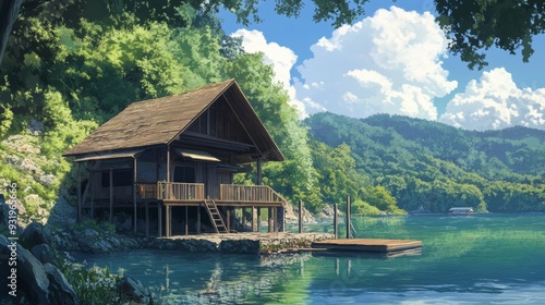 © Jayk, Naklejka premium Tranquil Lake house, anime style