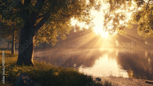 © Tasnim, Obraz premium Tranquil lake landscape at sunset with golden sunlight streaming through trees