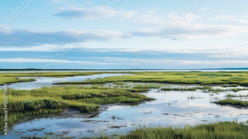 Fototapeta premium Tranquil lake landscape featuring marsh vegetation and a reflection of a gray...