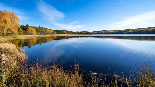 Fototapeta premium Tranquil Lake Landscape with Reflections of Autumn Trees Under a Clear Blue...