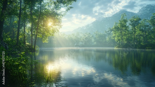 Obraz premium Tranquil lake nestled in a lush forest at dawn, sunbeams through trees