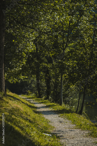 © Anze, Fototapeta premium Tranquil lake of Soca river at Most na Soci in early morning. View from between the trees towards a gravel path next to the lake.