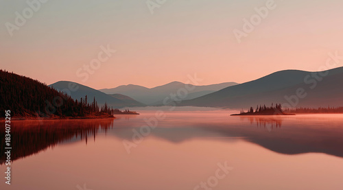 Fototapeta premium Tranquil lake perfectly mirrors pink sunset sky and surrounding mountain wilderness scenery.