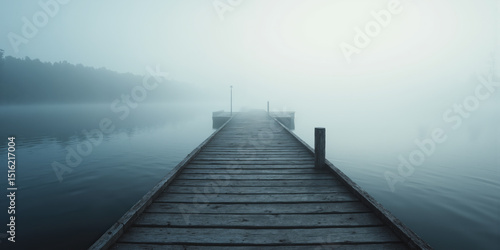 © panophotograph, Naklejka premium Tranquil lake pier in morning fog Mindfulness and meditation concept Tranquil lake pier extending into misty waters, foggy early morning