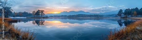 Fototapeta premium Tranquil lake reflecting dawn's first light, serene and peaceful