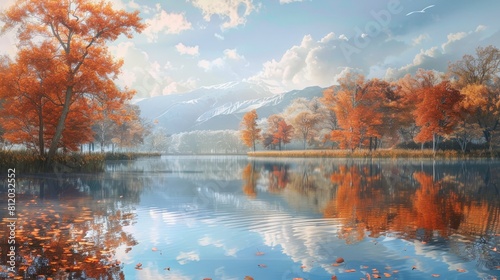 Naklejka premium Tranquil lake reflecting the stunning hues of autumn leaves