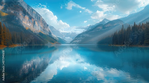 © rachmat, Fototapeta premium Tranquil lake reflecting towering mountains