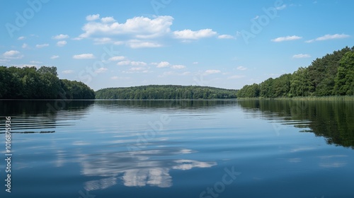 © Mykhailo Podolian, Fototapeta premium Tranquil lake reflects cloudy blue sky and lush green trees on a serene summer day