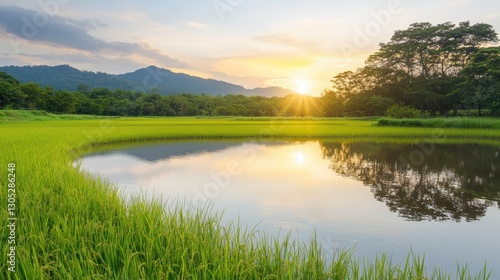 © ชลธิชา สว่างวงค์, Obraz premium Tranquil lake scene, lush green grass growing peacefully in the calm water, creating a serene natural landscape