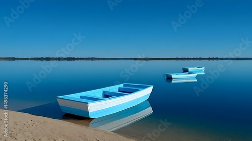 © moon_, Naklejka premium Tranquil Lake Serenity: Three Boats at Rest