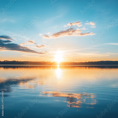 © Badhyajit, Fototapeta premium tranquil lake sunrise reflecting sunlight in scenic beauty