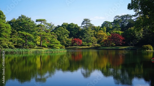 Fototapeta premium Tranquil lake surrounded by vibrant trees and shrubs reflecting in calm water under clear blue skies