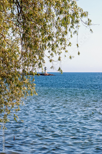 © Lars Johansson, Fototapeta premium Tranquil lake with a lighthouse and overhanging lush green tree branches