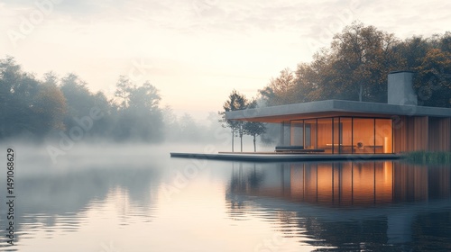 © lartestudio, Fototapeta premium Tranquil lakefront cabin nestled amidst misty morning.