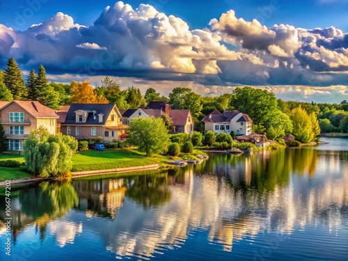 © Supittra, Fototapeta premium Tranquil Lakefront Homes Surrounded by Lush Greenery Under an Ominous Sky – Summer Landscape
