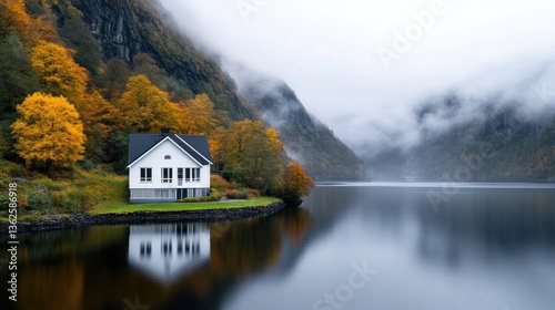 © danadesa, Fototapeta premium Tranquil Lakeside Cabin in Autumn (1)