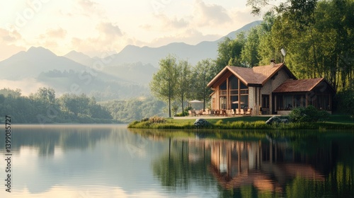 © Gibran, Fototapeta premium Tranquil Lakeside Cabin Retreat in the Mountains