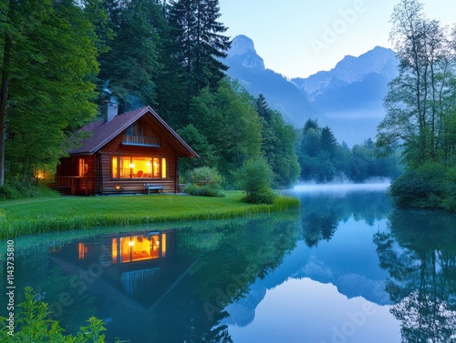 © Richafuji, Fototapeta premium Tranquil Lakeside Cabin Retreat in the Serene Mountain Valley at Dusk