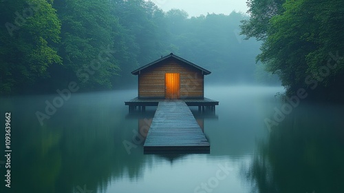Fototapeta premium Tranquil Lakeside Cabin Surrounded by Fog and Lush Greenery at Dusk, Warm Glow from Door Illuminates Serene Waters Reflecting Nature's Beauty