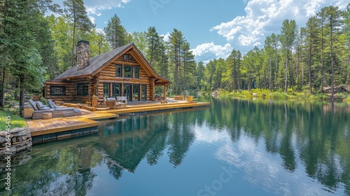 © Nefo, Fototapeta premium Tranquil lakeside cabin surrounded by lush trees and reflective water, ideal for relaxation