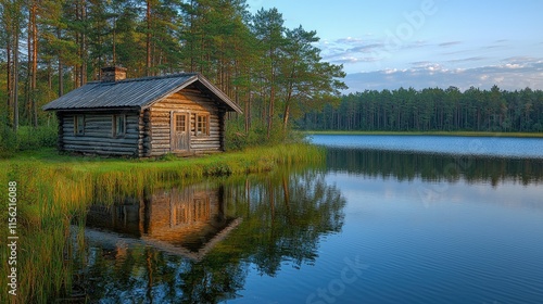 Fototapeta premium Tranquil lakeside cabin surrounded by trees and reflecting in calm water.