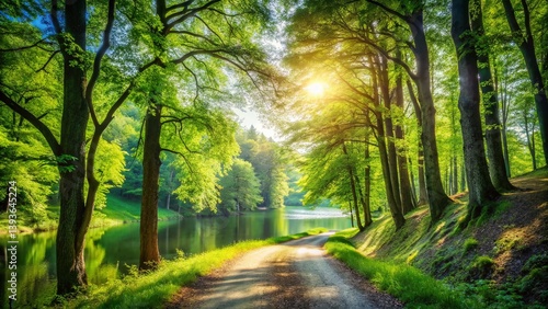 © Four888, Obraz premium Tranquil Lakeside Forest Path A Serene Escape to Natures Embrace