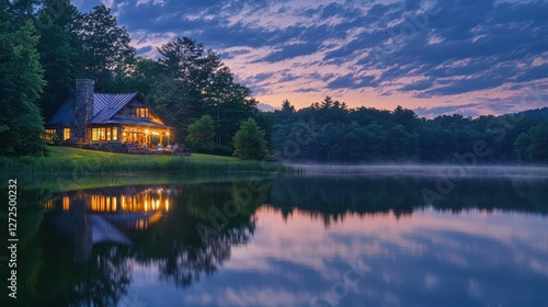 © Kitta Studio, Fototapeta premium Tranquil Lakeside Haven at Dusk with Reflective Water and Trees