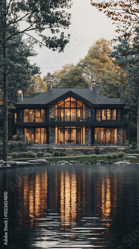 © Tuachan, Obraz premium Tranquil Lakeside Mansion with Large Windows