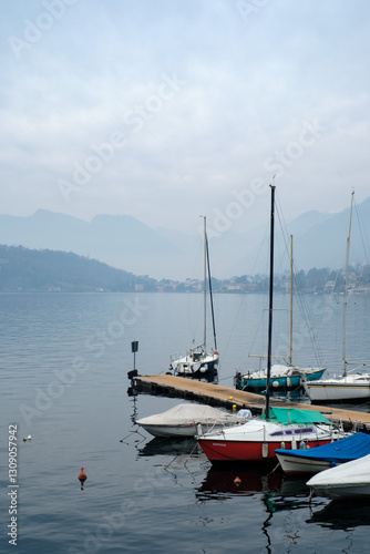 © ottaviocamb, Fototapeta premium Tranquil lakeside marina with moored sailboats, calm water reflections and misty mountain backdrop creating a peaceful nautical atmosphere