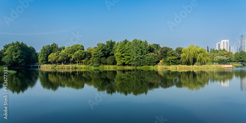 © evening_tao, Fototapeta premium Tranquil Lakeside Reflection with Lush Greenery and Urban Backdrop